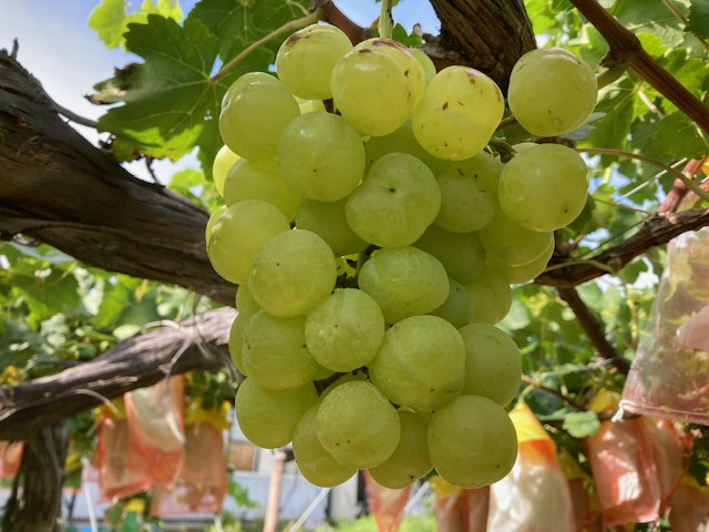 観光ぶどう園オープン 観光ぶどう園が8月30日(土)にオープンいたしました。 本当に暑い中ご来園いただき有難うございます。 画像は、比較的新しい品種のクイ-ンセブンです。 皮ごと食べられて大変甘いのでお子様にも人気のぶどうです。 まだ若い木で房数も少なくまもなく終了となりますが、今後 増やしていく予定ですので、ぜひ機会を作っていただいて 食べに来ていただきたい品種です。 観光ぶどう園は、28日までの開園となります。